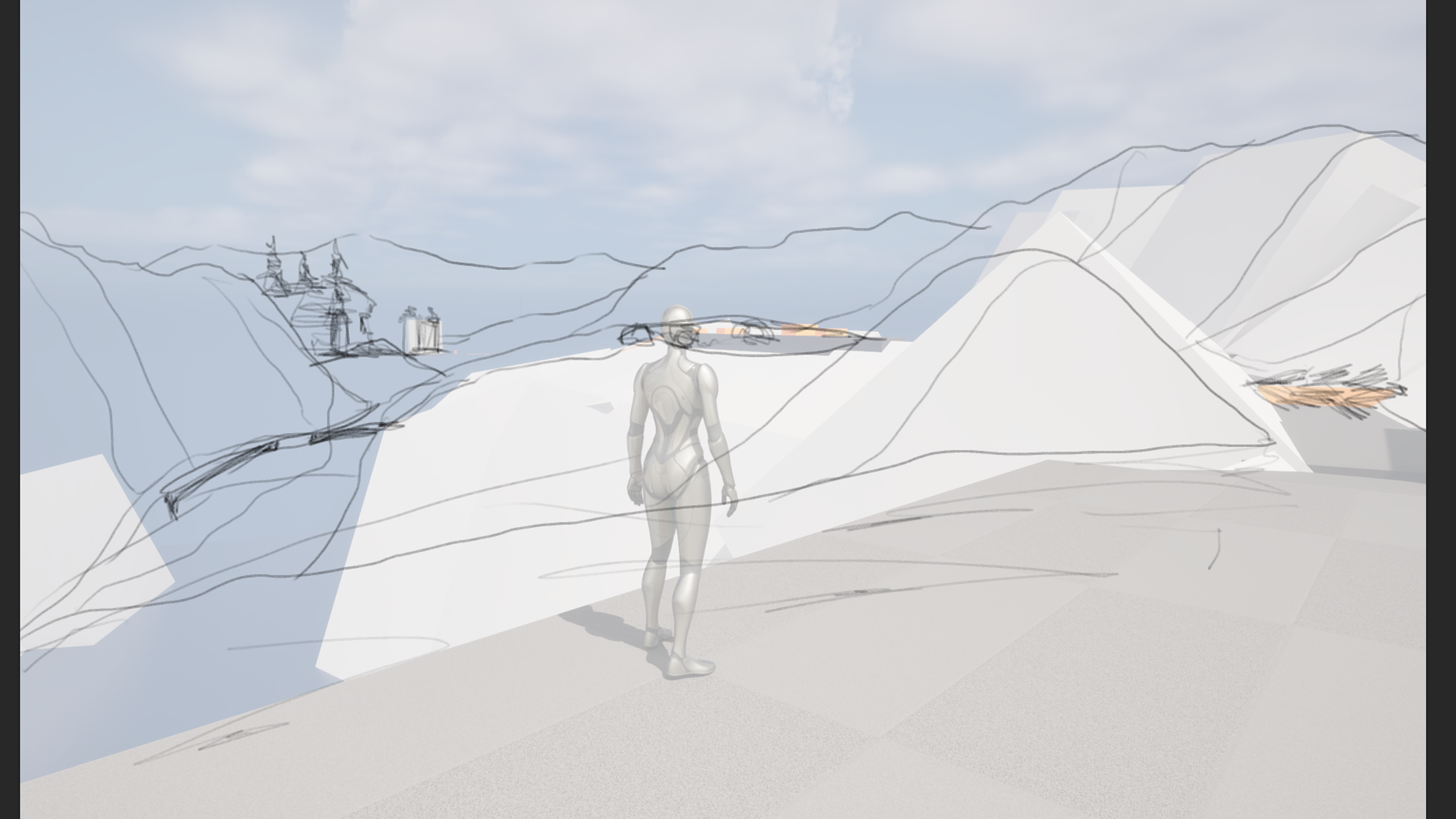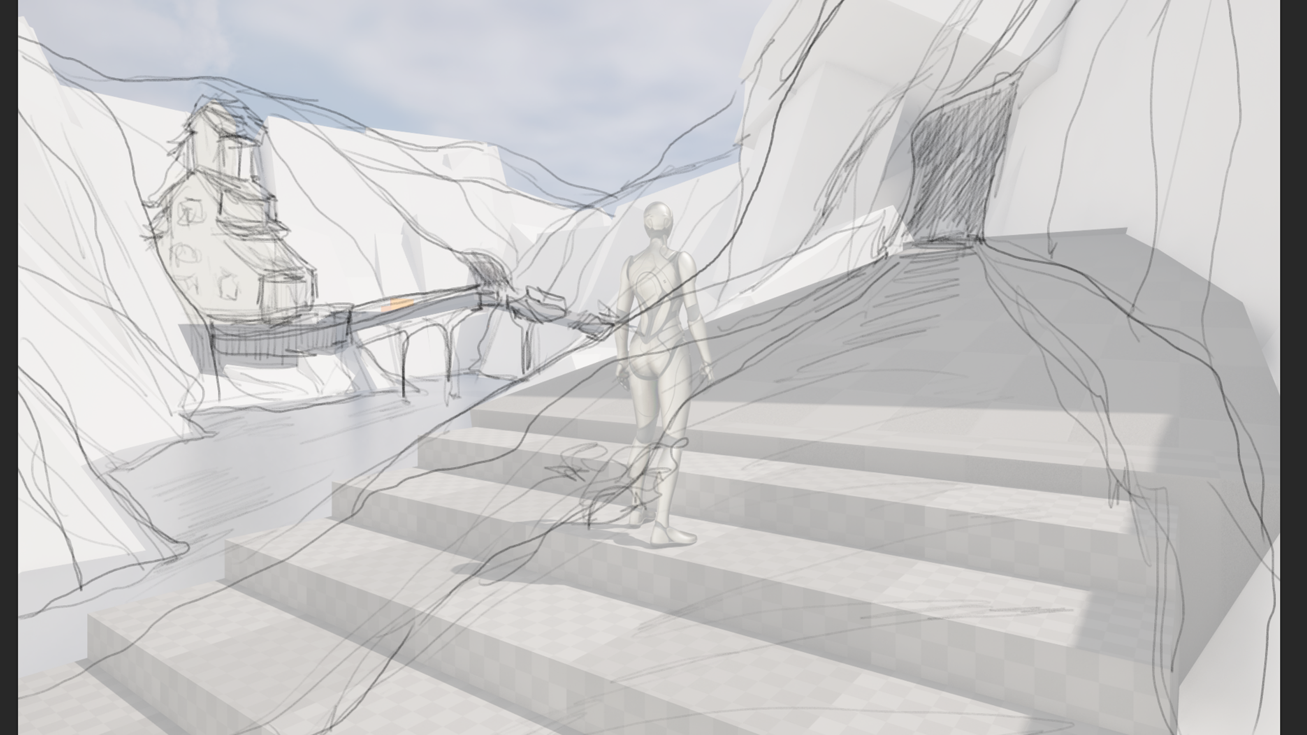 – Viewpoints act as orientation points, helping the player understand where to go next – Openings and framing guide player movement forward – Landmarks, including the temple, provide a clear long-term objective